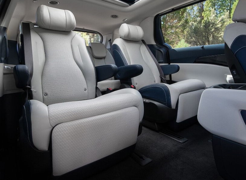 Inside the Carnival Hybrid, you'll find a roomy and upscale cabin with seating for seven or eight passengers, depending on configuration. Features include leather upholstery, heated and ventilated front seats, tri-zone automatic climate control, and a hands-free power liftgate. The Kia Carnival has innovative seating like slide-flex seating, VIP lounge second-row seats with power controls and wing-out headrests.